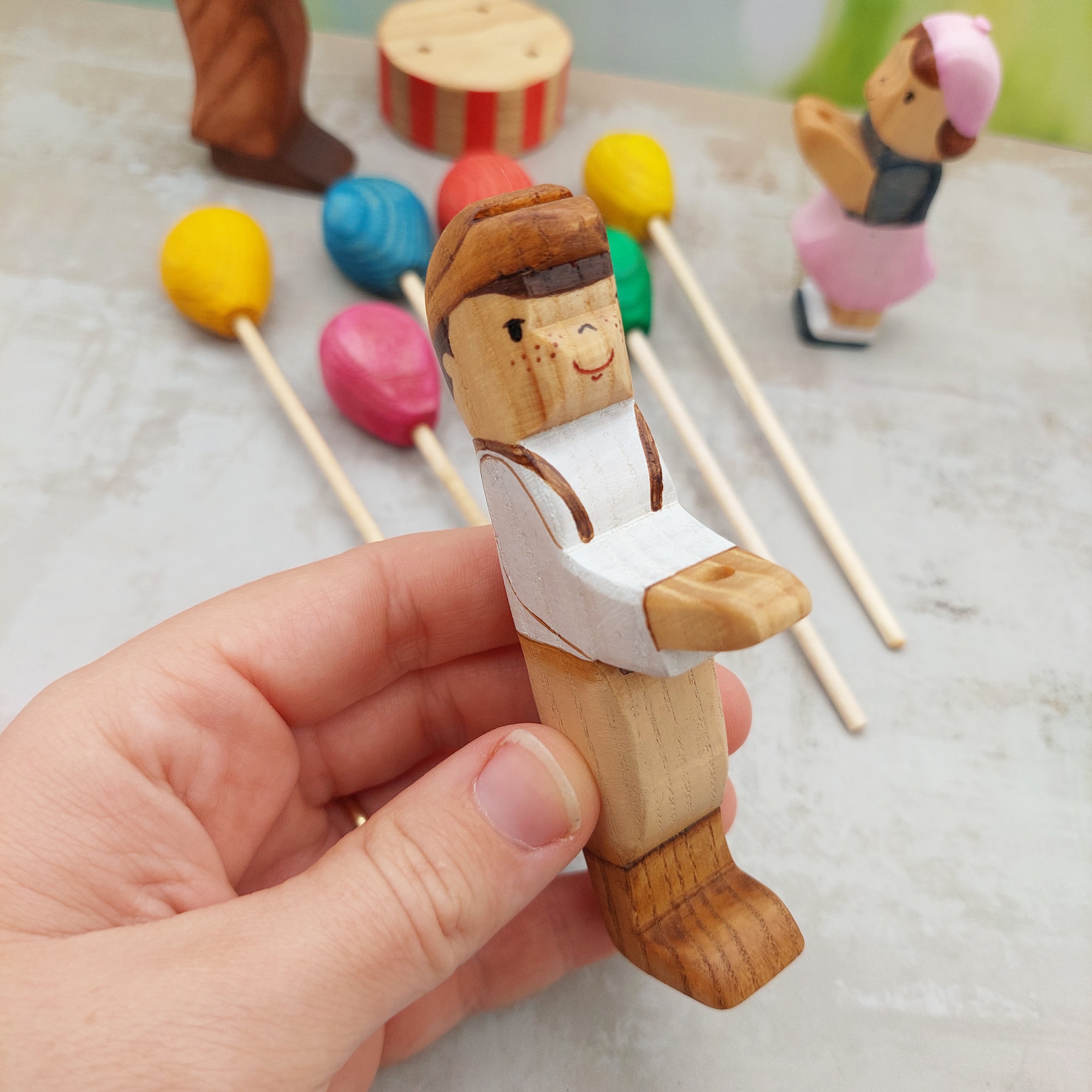 Bring the magic of the fairground home with this charming wooden toy set. A dapper balloon seller in his striped shirt, red neckerchief, and tall top hat stands ready to delight two eager children – a boy in suspenders and a girl in her pink dress and beret.