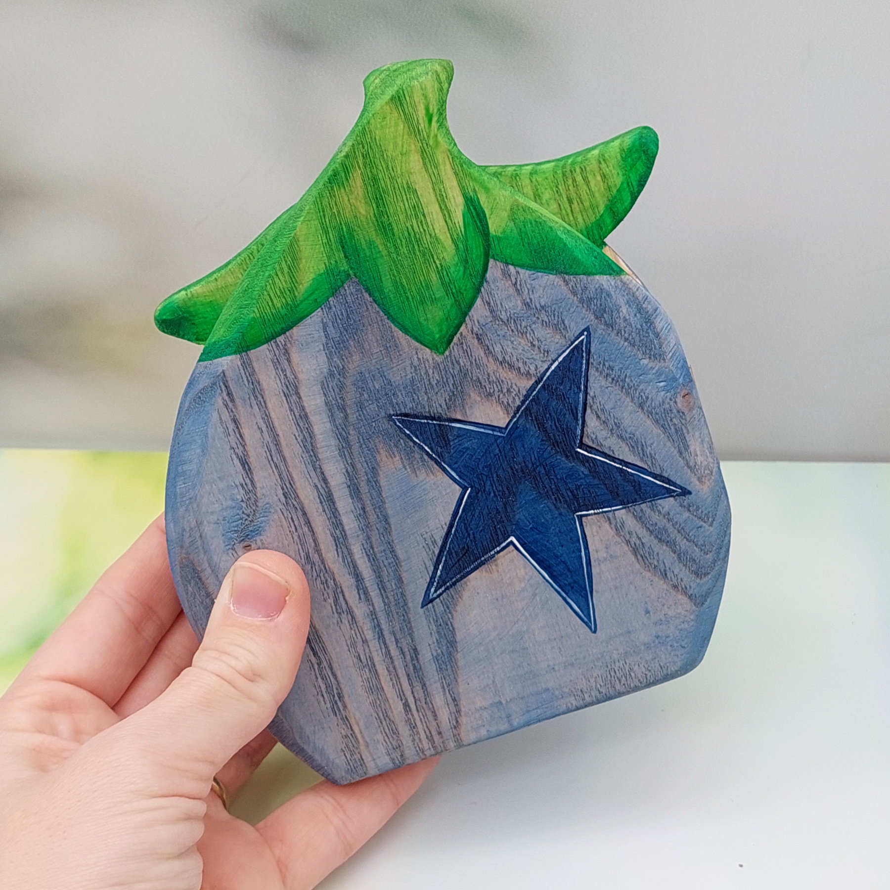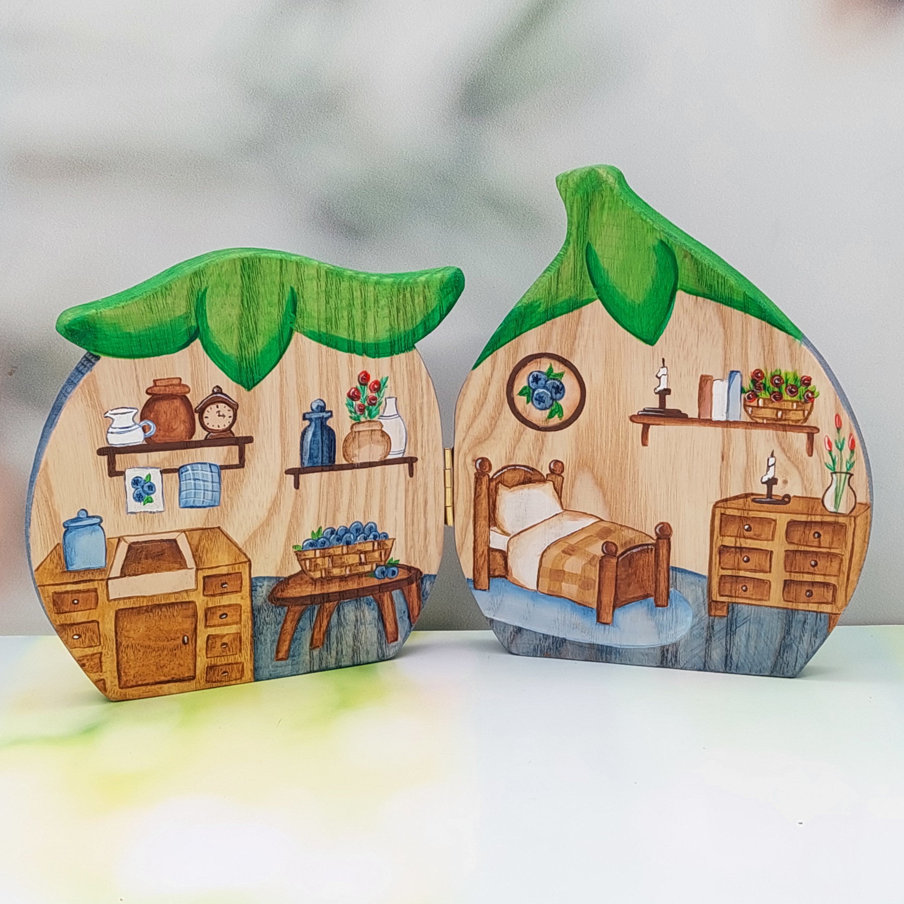 Welcome to our Blueberry Fruit House : one of four limited edition fruit house designs. Each little cottage can be displayed both open and closed. They are hinged and open like a book. The inside and outside is painted with exquisite details: a true collector’s piece. Made from solid ash hardwood.