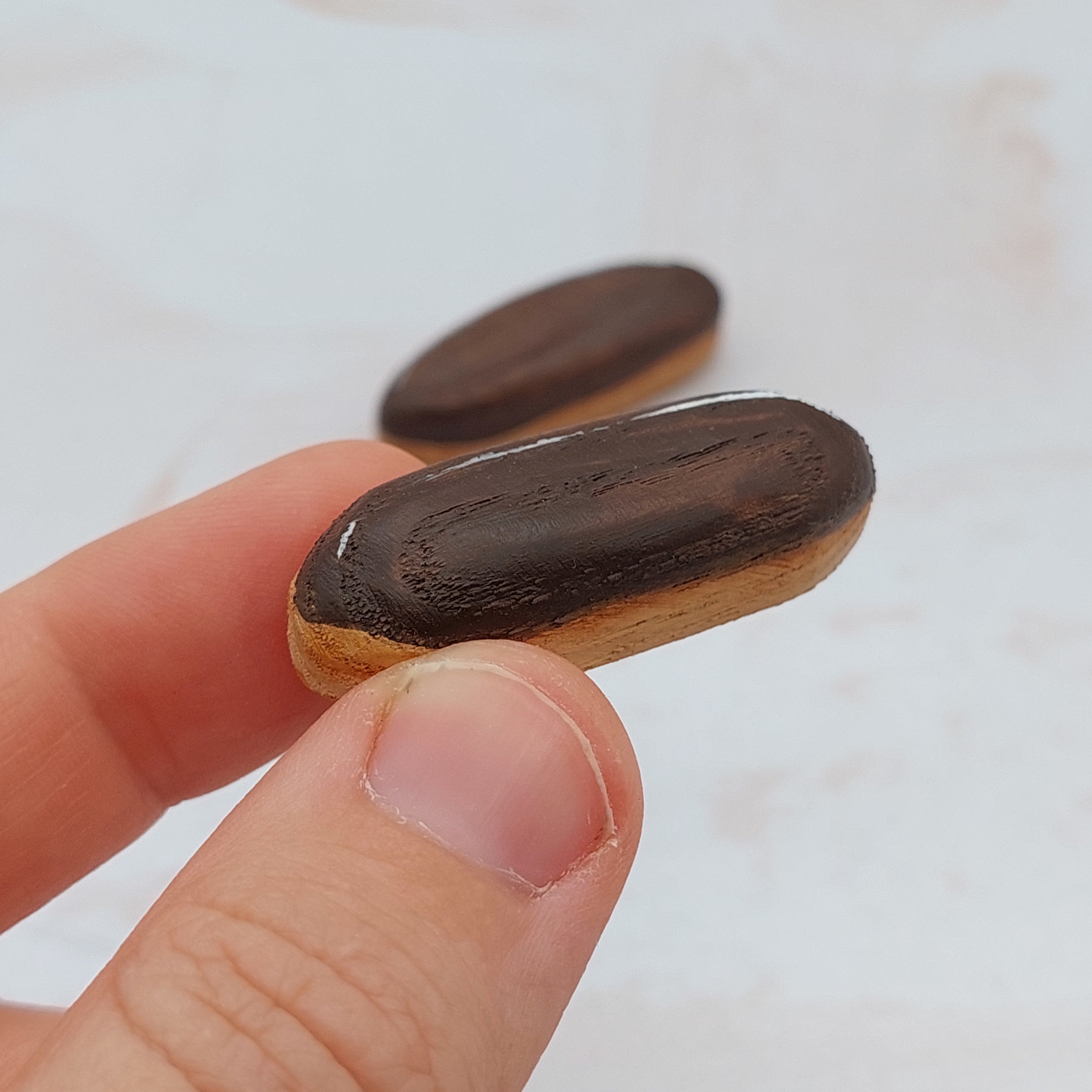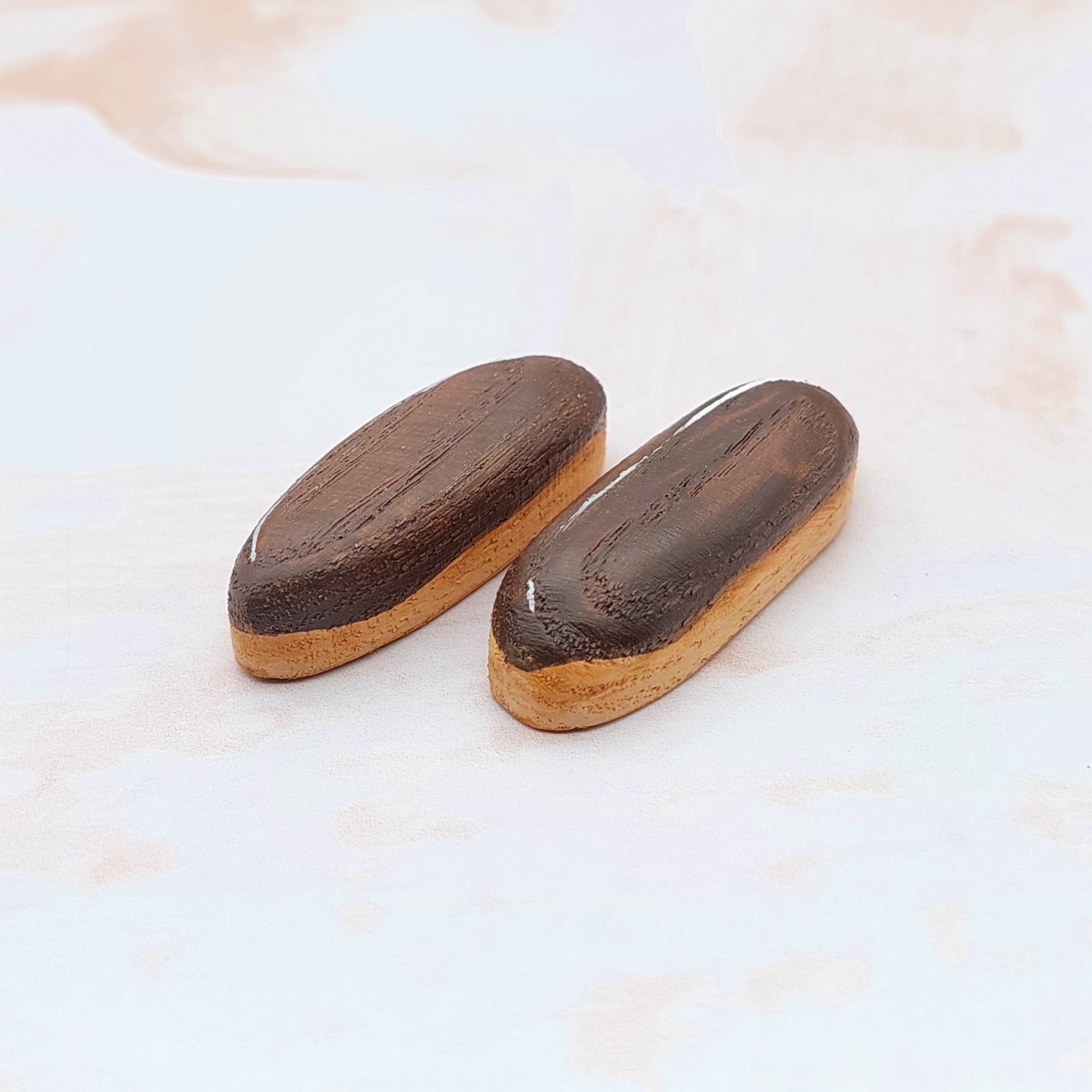 Two delicious chocolate éclairs, each with a golden choux pastry base and rich chocolate glaze. Hand-crafted from natural wood with realistic painted details. Perfect for pretend bakery play or dollhouse displays.