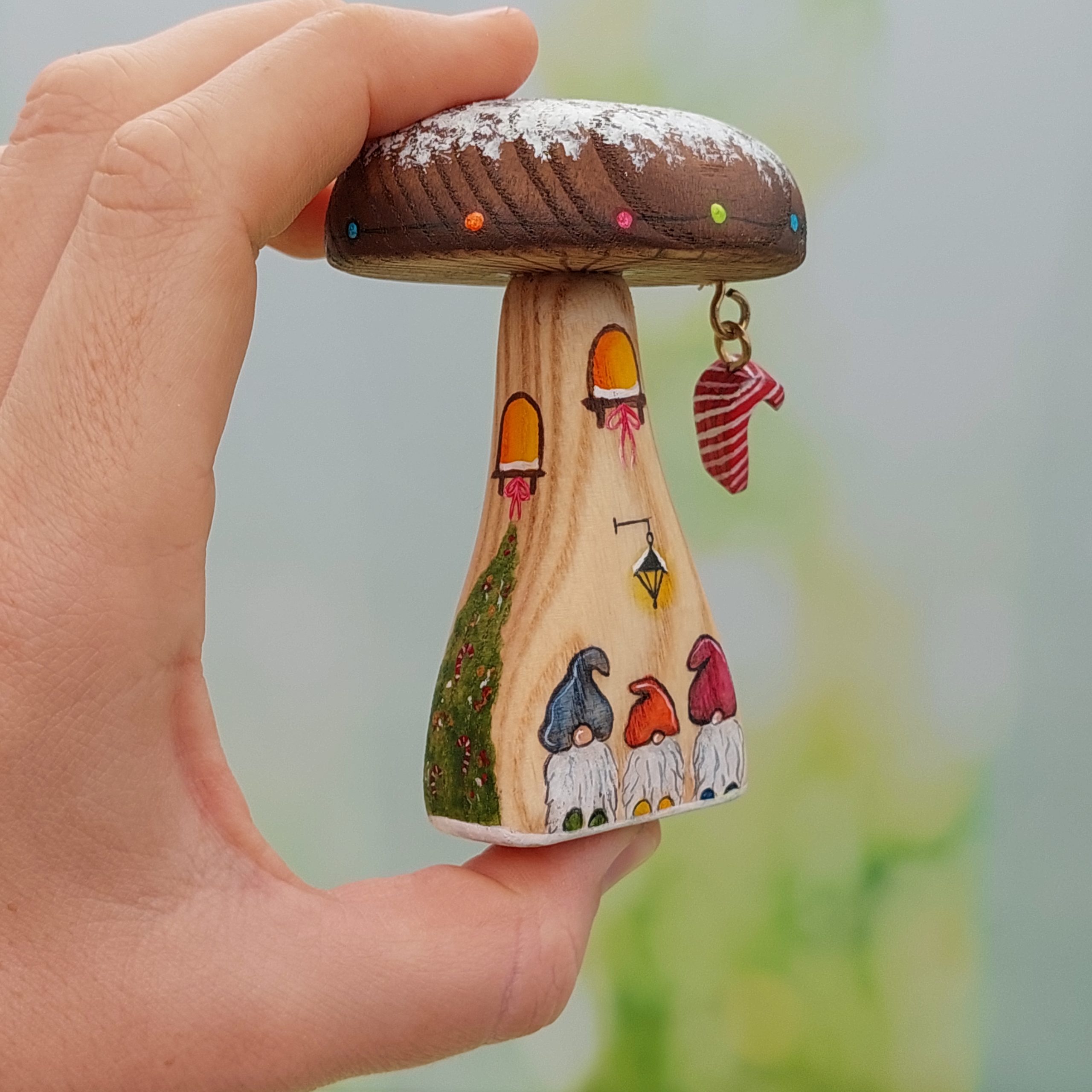 Crafted from solid ash hardwood. The candy cane mushroom stands 8.5cm high and is 6cm wide.