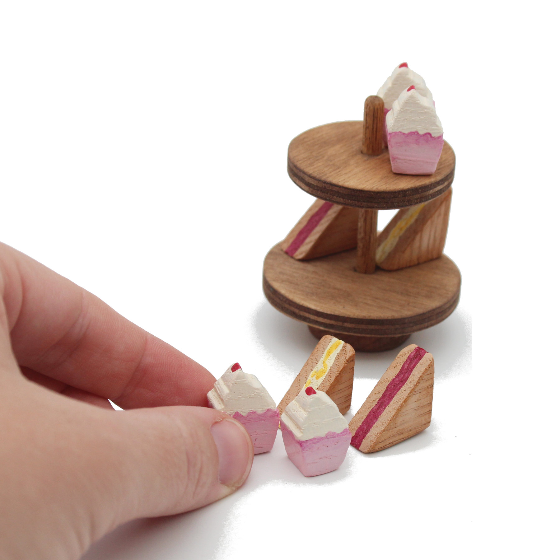 Beautiful wooden cake stand set featuring cupcakes and sandwiches, all hand-painted with exquisite detail. Perfect for tea parties, displays, or imaginative play.