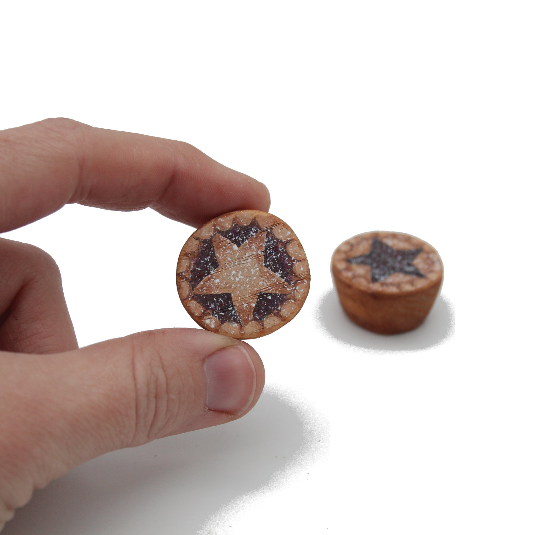 Set of two finely detailed miniature mince pies. Handmade and perfect for Christmas displays or dolls-house festive scenes.