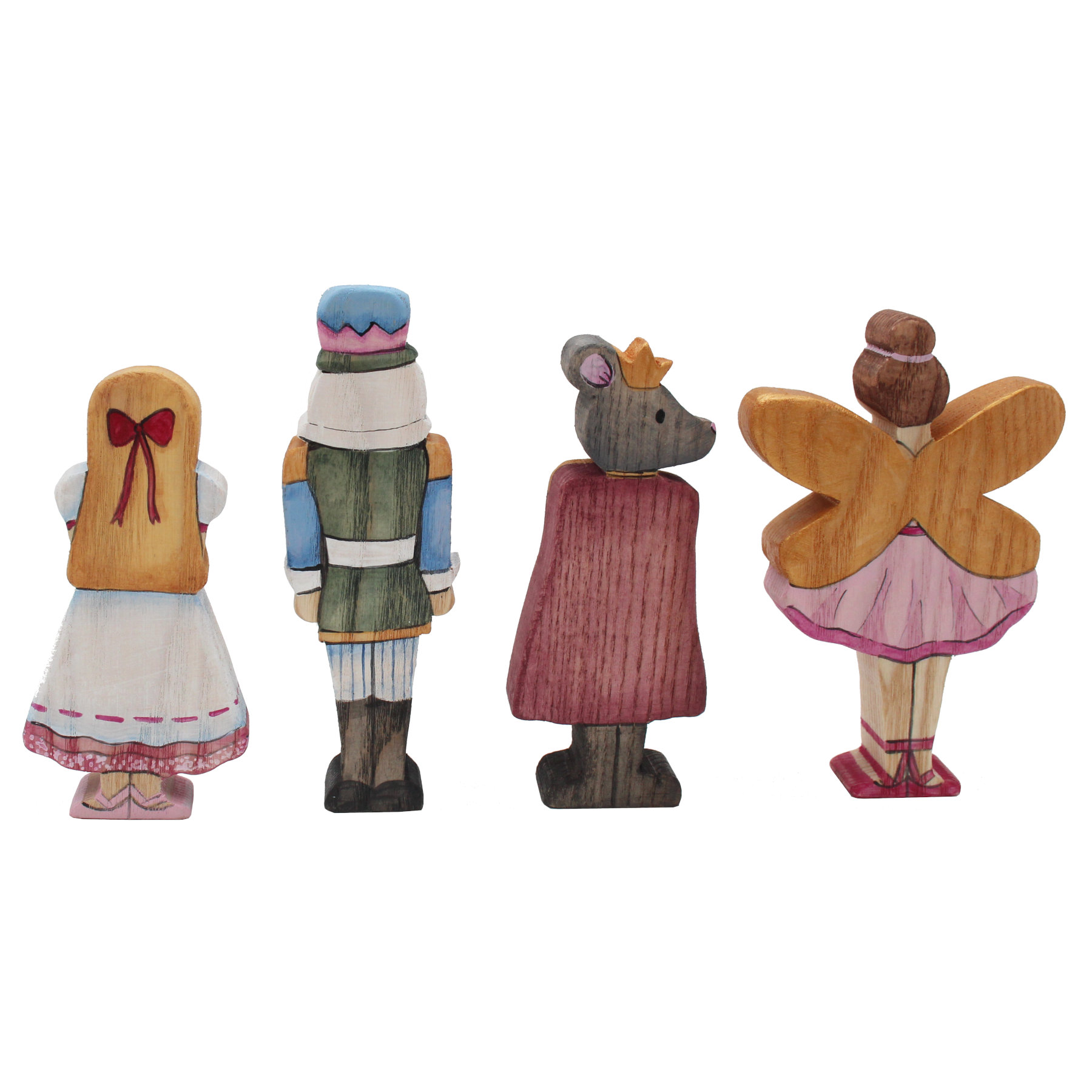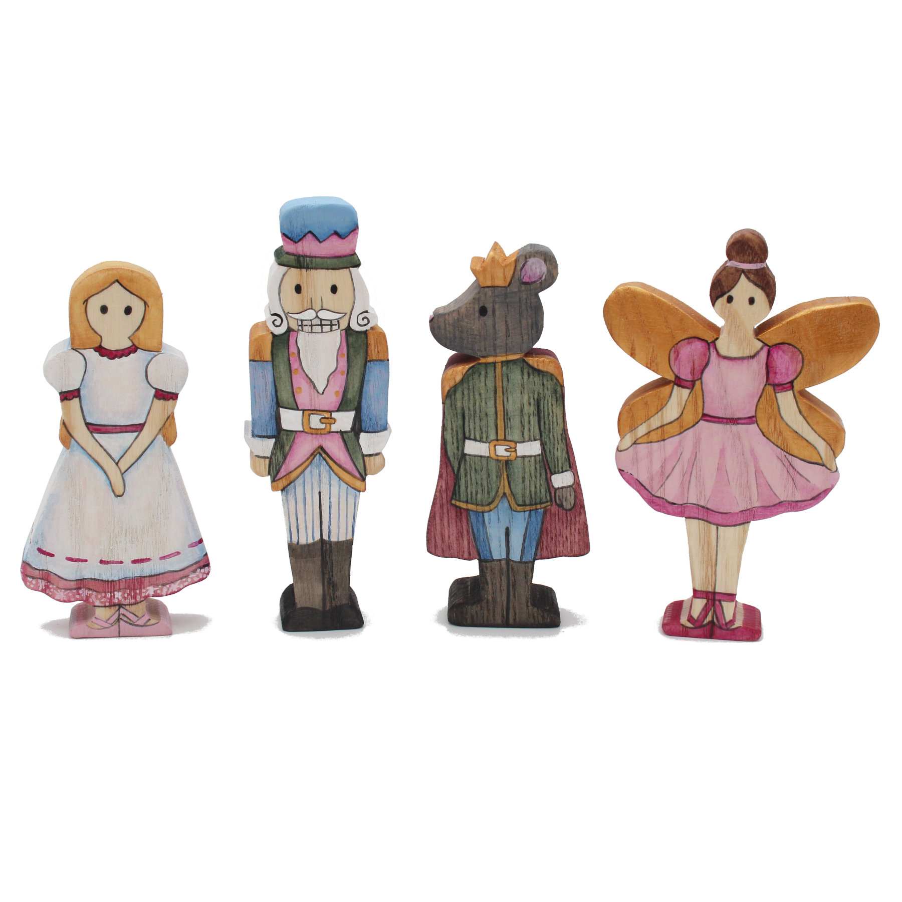 Our wooden Nutcracker Set is based on the classic ballet story of the same name and features the 4 main characters: Clara, The Nutcracker, The Sugarplum Fairy and the Rat King. This set looks beautiful as an ornamental set, but is also sturdy enough for actual play, making it ideal as a gift for children or adults alike.