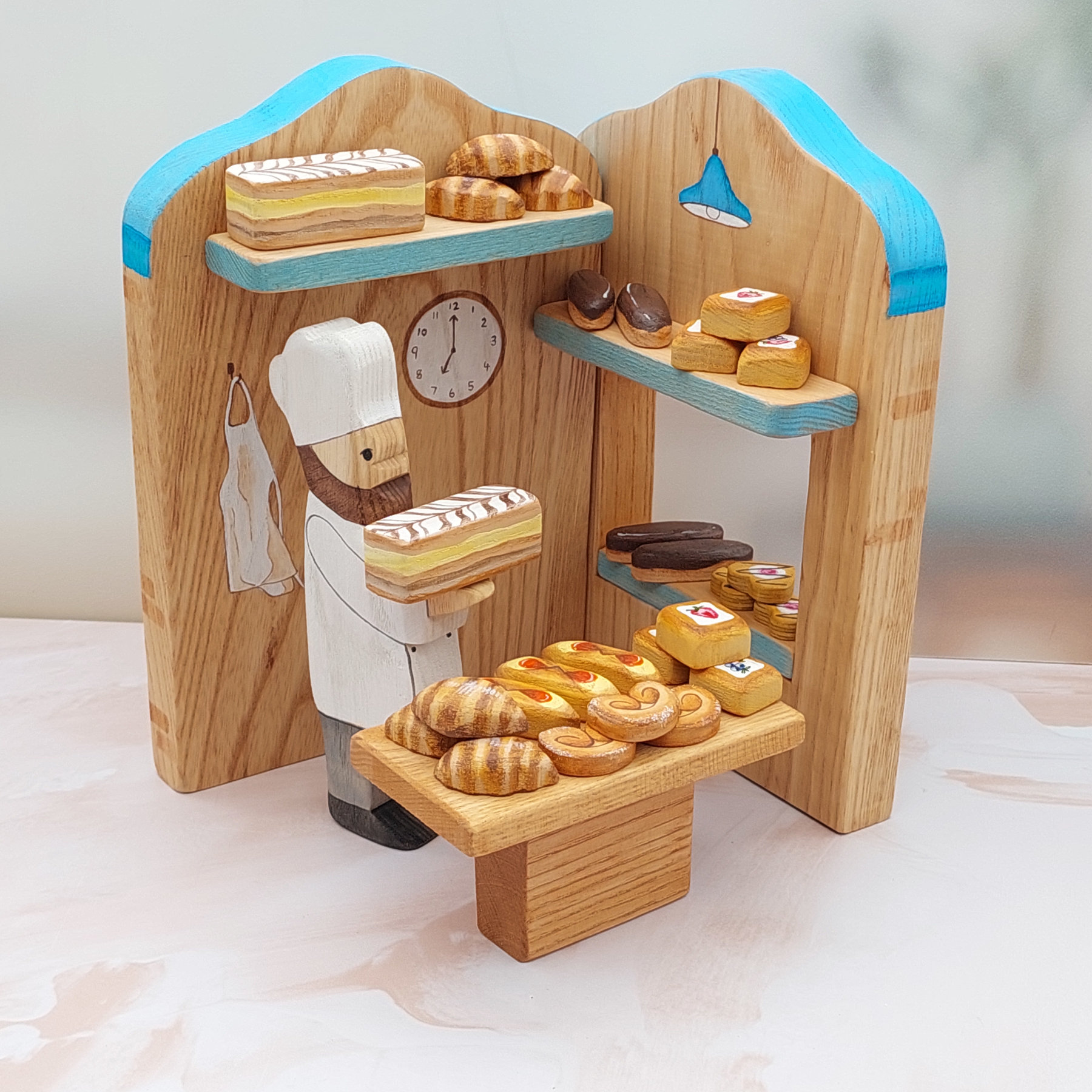 The set includes a pastry chef figure in white uniform and chef’s hat, a wooden display table and an assortment of delicious miniature pastries ready to fill the shelves and delight customers.