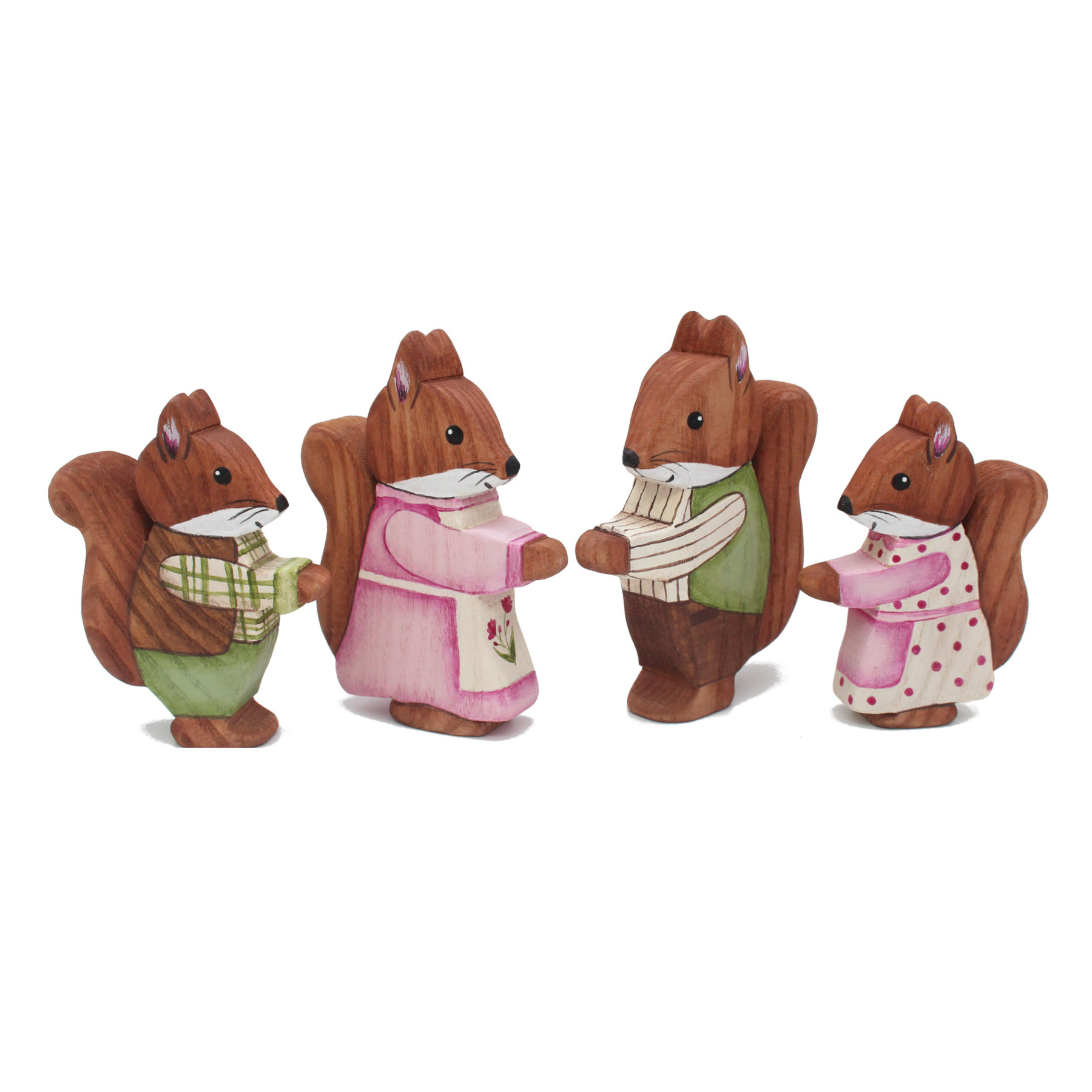 Set of four squirrel family figures, lovingly hand-painted with highly detailed outfits in shades of green, brown, pink and white. Perfect for storytelling and display. Each squirrel is also available individually.