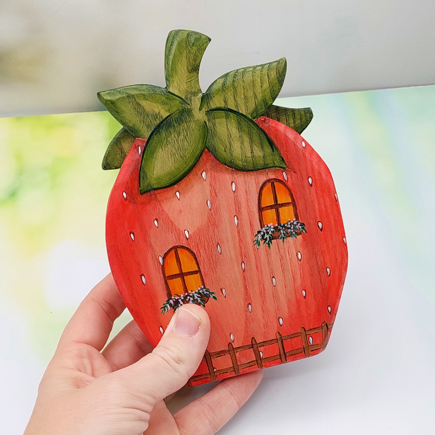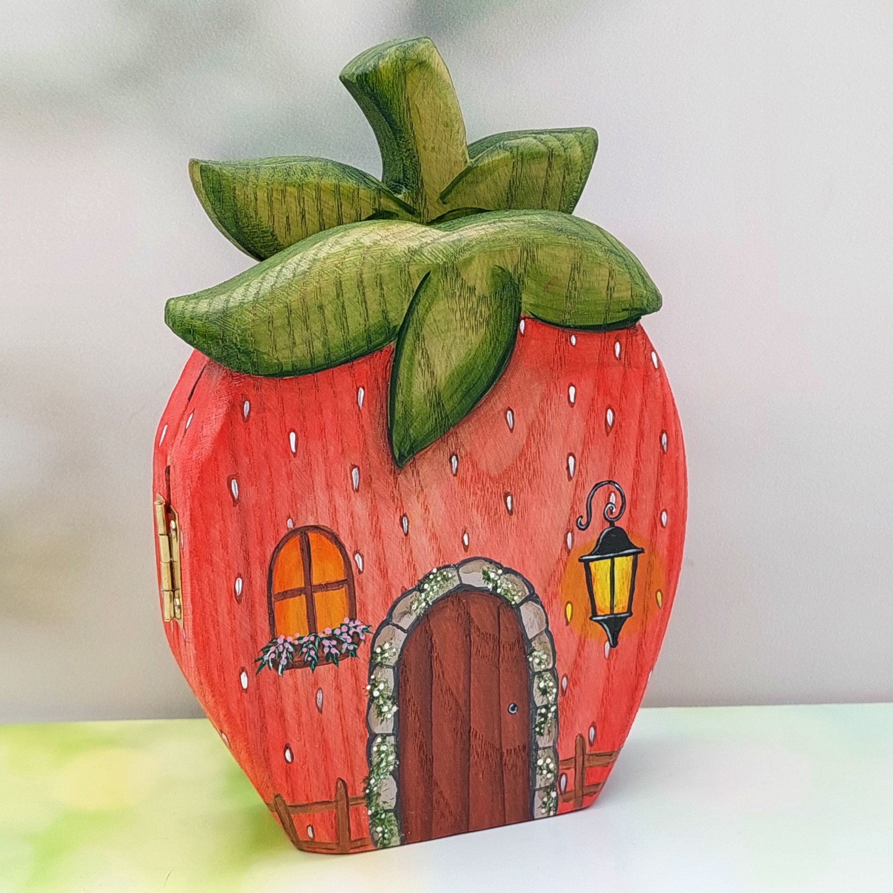 Welcome to our Strawberry Fruit House : one of four limited edition fruit house designs. Each little cottage can be displayed both open and closed. They are hinged and open like a book. The inside and outside is painted with exquisite details: a true collector’s piece. Made from solid ash hardwood.
