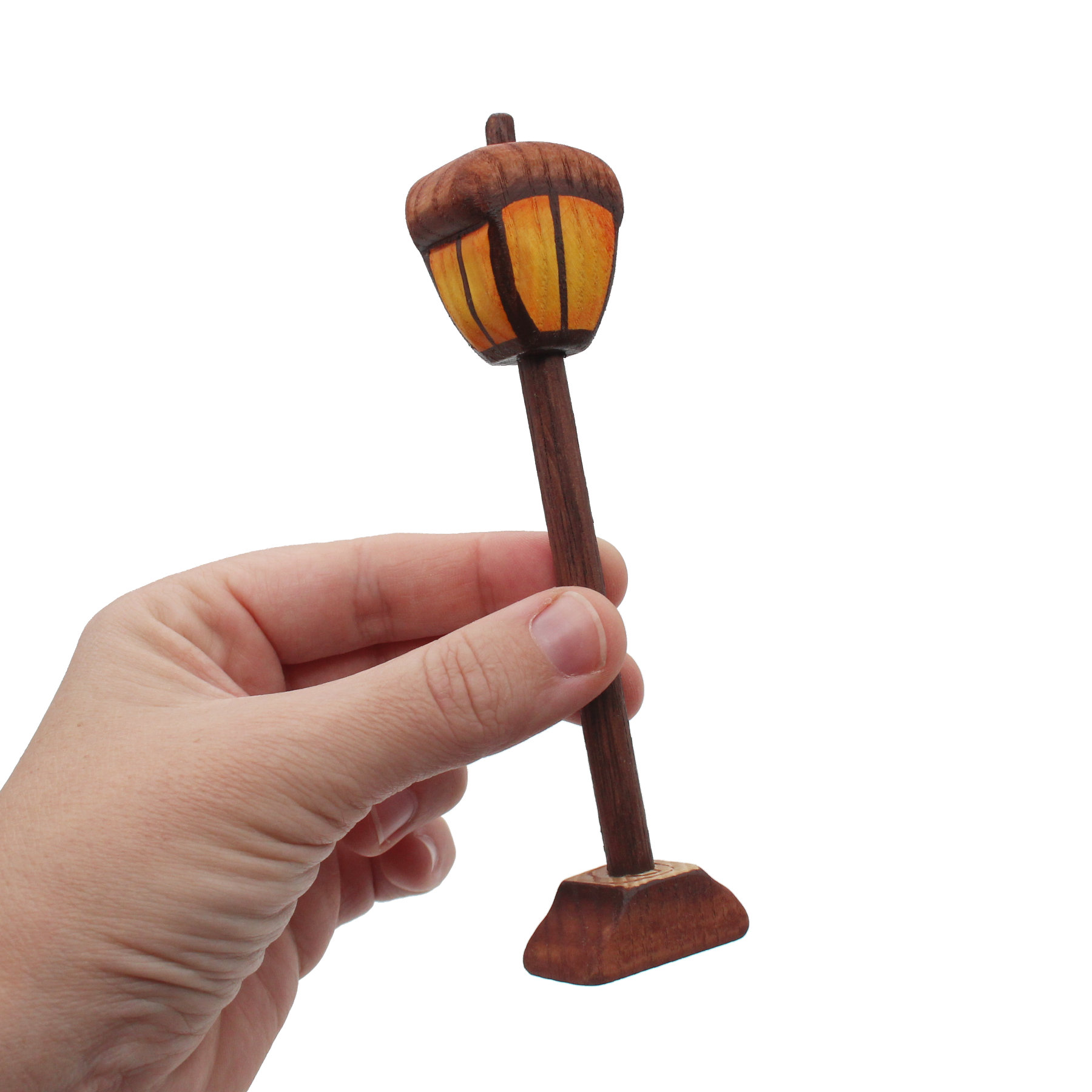Handcrafted wooden street lantern with acorn detail, painted to glow warmly. Perfect for forest scenes, displays, or storytelling.